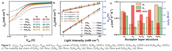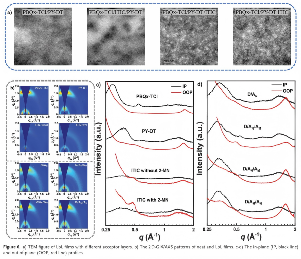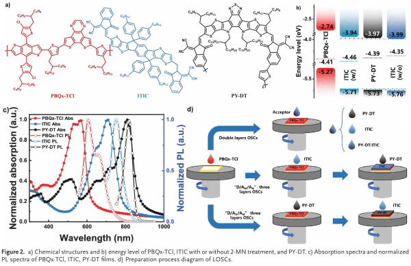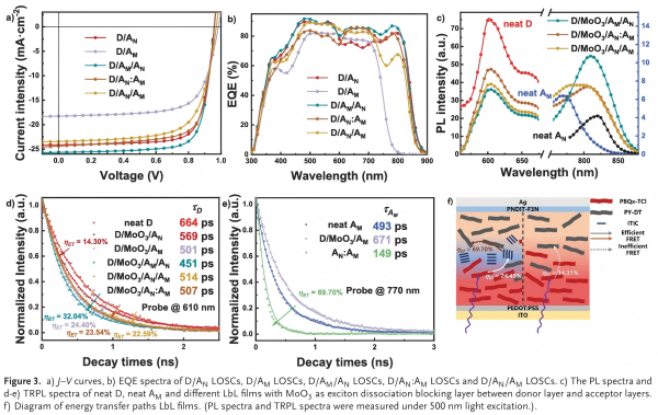 在有机太阳能电池(OSCs)中,可以通过添加第三组分构建三元OSCs来拓展吸收光谱提升器件性能。为了提高三元OSCs的性能,第三组分必须与宿主供体和受体具有良好的相容性才能形成合金态,而选择合适的与宿主材料相容性良好的第三组分绝非易事。近期,逐层沉积型有机太阳能电池(LOSCs)受到了越来越多的关注。LOSCs具有组分垂直分布易于控制、能够使用混溶性较差的组分制备的固有优势。基于此,张福俊团队开发了一系列三层结构的LOSCs,通过调控给体组分PBQx-TCl,受体组分PY-DT和第三组分ITIC的沉积顺序,不同LOSCs表现出了迥异的光伏性能。“PBQx-TCl/ITIC/PY-DT”有源层的三层LOSCs取得了18.79%的最高效率。第三组分ITIC具有与主体系互补的吸收光谱,能够补充主体系在700 nm附近波段的吸收不足。同时,具有中等带隙的ITIC能够充当PBQx-TCl与PY-DT能量传递的中继体,提高能量传递效率,从而增加激子利用率。此外,“PBQx-TCl/ITIC/PY-DT”结构形成了良好的能级级联结构,有助于载流子的输运。最后制备给体层的反型结构器件进一步证实了以上结论。这些发现凸显了三元有机太阳能电池中三个组分的垂直分布对器件性能有相当的影响,而通过逐层沉积技术,可以有效的调控组分垂直分布,从而实现理想的有源层结构,提升器件性能。
